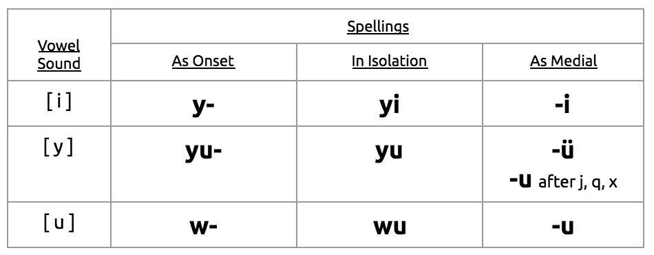 Table 1: Pinyin spellings of glide vowels [i y u] according to position within the syllable.