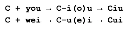 But for those rhymes with the main vowel e/o, a letter is dropped in the spelling when an initial consonant is added to the rhyme. The rule is: between letters U and I, drop a main vowel letter E or O. My slogan for this is “Between U & I”, as the rule applies to either ordering of these two letters, -iou or -uei. Using “C” to stand for any (non-zero) initial consonant, the first step is adjustment of y/i and w/u: