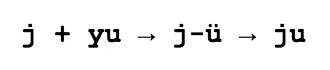 But if the initial consonant added to the vowel yu is one of the palatal series, namely j-, q-, x-, we omit the dots. This is because the vowel wu (IPA [u]) cannot occur in Mandarin in a syllable with these initials. So let’s derive the correct spelling of the syllable ju, as in 居 jū ‘to live / reside’. The first step is the usual adjustment in spelling of the glide yu/ü, followed by the dropping of the two dots: