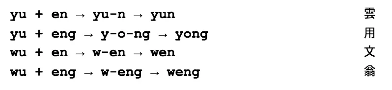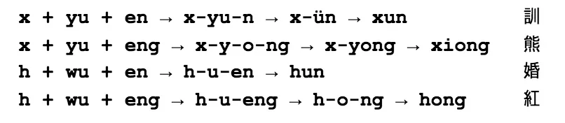 There are discrepancies in the sound here as well as in the spelling. Whereas the syllable xun rhymes with yun and xiong rhymes with yong, the ones with medial wu are pronounced one way with a zero initial and another with an initial consonant. Zero-initial wen is pronounced [wən] (quite close to English “one”) and weng is [wʌŋ], while the rhyme of hun is [un] and that of hong is [oŋ] or [uŋ]. Listen to the different vowel sounds in these words.