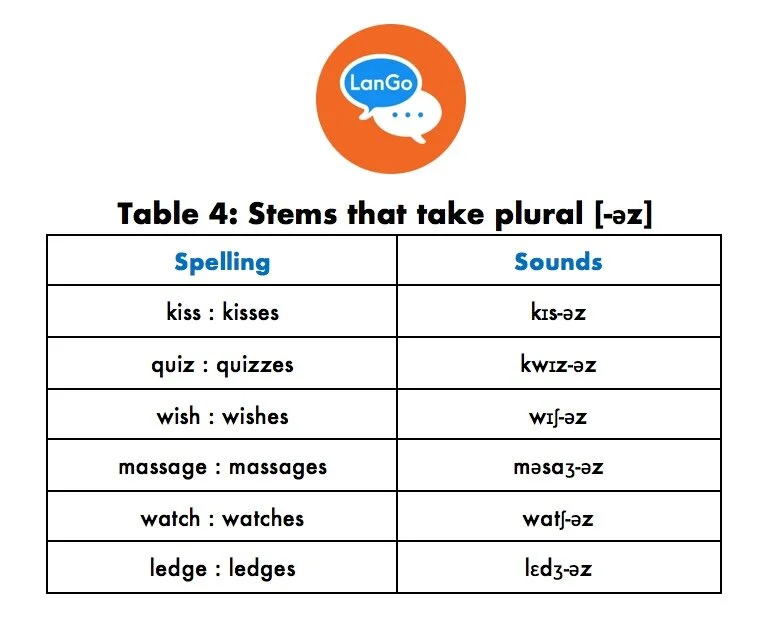 Table 4 illustrates words with different final sounds that all get the [-əz] plural. It is worth noting that the English spelling of these words adds a vowel that separates the last consonant sound from the plural!
